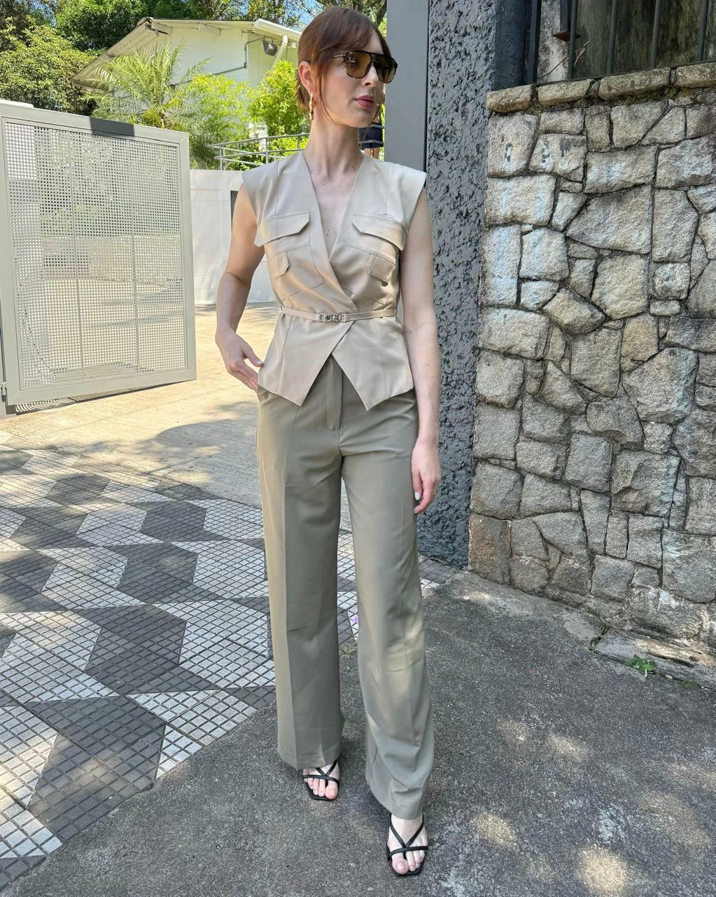 Modelo de calça pantalona com cós alto, botões internos e bolsos nas laterais e costas.