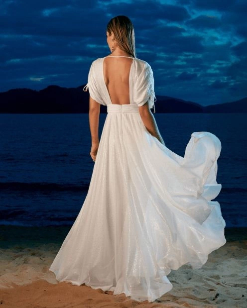 O Vestido Longo é a escolha perfeita para brilhar em qualquer ocasião! Com um decote profundo e mangas curtas que possuem passante para ajustar ao corpo, ele se adapta ao seu estilo. A cintura com franzido e transtasse valoriza a silhueta, enquanto as costas vazadas com faixa fixa trazem um toque ousado. O fechamento com zíper na saia garante praticidade e conforto. Confeccionado em chiffon com foil dourado, ele é leve e perfeito para arrasar em festas ou eventos especiais. Com forro interno, você vai se sentir à vontade e linda! Combine com sandálias de salto ou rasteirinhas e esteja pronta para receber todos os elogios!